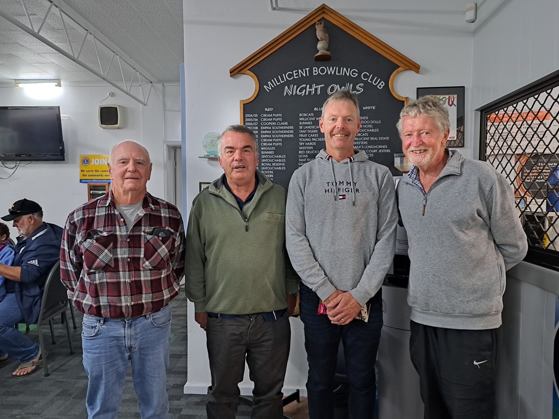 Winners in White Division: X FACTOR (Jean Smith, Derrick Lindh, John  Rivett, Mark Skeer) defeated Goobies 29+21, Half Cut 28+11, Newbery Newbies 28+10, Easy Beats 28+8, Lions Roar 28+6.
