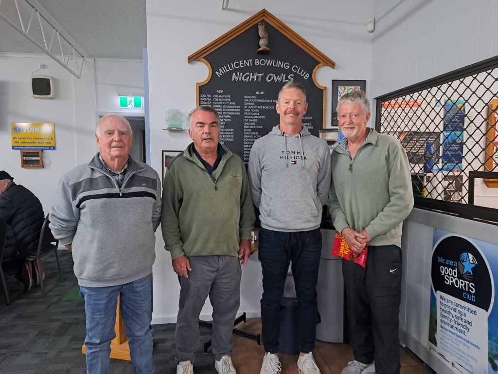 Winners in Blue Division: Try Hards (Peter Johns, John Eldrdge, Arnold Damhuis, Graham Attiwell) defeated Miss Fitts 26+12, Here 4 Beer 26+8, Black Beetles 25+7, with Acky’s Owls and Sparkies having aa draw.