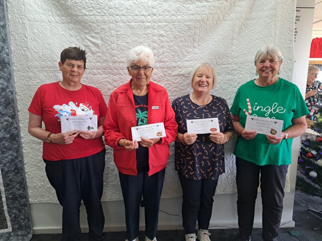 Lyn Scudds, Mary Campbell and Ros Varcoe and Sarah Ross, Elaine Goode and Joy Warren. The Scudds team, won 12 of the 18 ends and the title of Triples Champions for 2025/26 Season.