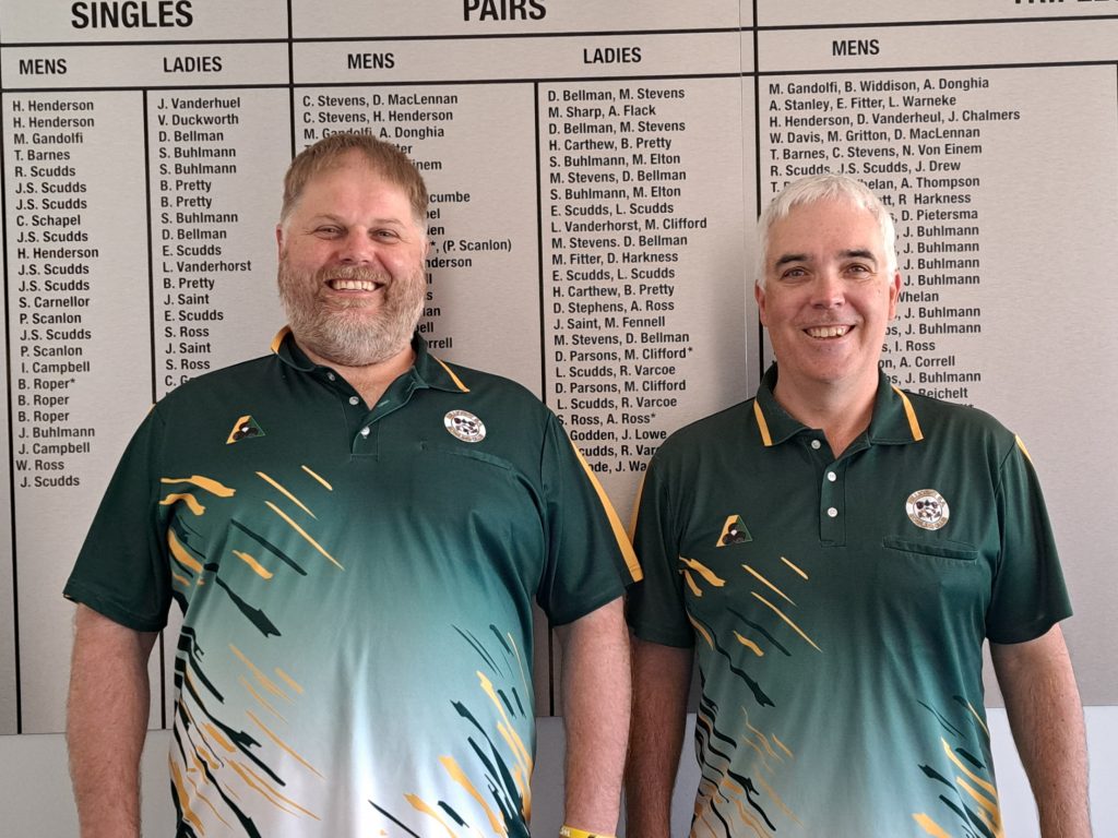 Aaron Emerson, President of the Millicent Bowls Club, and his bowls partner Chis Flavel from Lockleys Bowls Club went to Port Noarlunga to compete in the Para State Pairs Bowling Competition.  The competition was played over two days which saw them have a  convincing section win with 3 wins and 35 shots up.  The next day they had a tough first game  but won 16-7 taking them through to the Grand Final.  In a low scoring grand final, starting shot by shot, Aaron and his partner Chris won 11-4 to be State Para Pairs Champions.