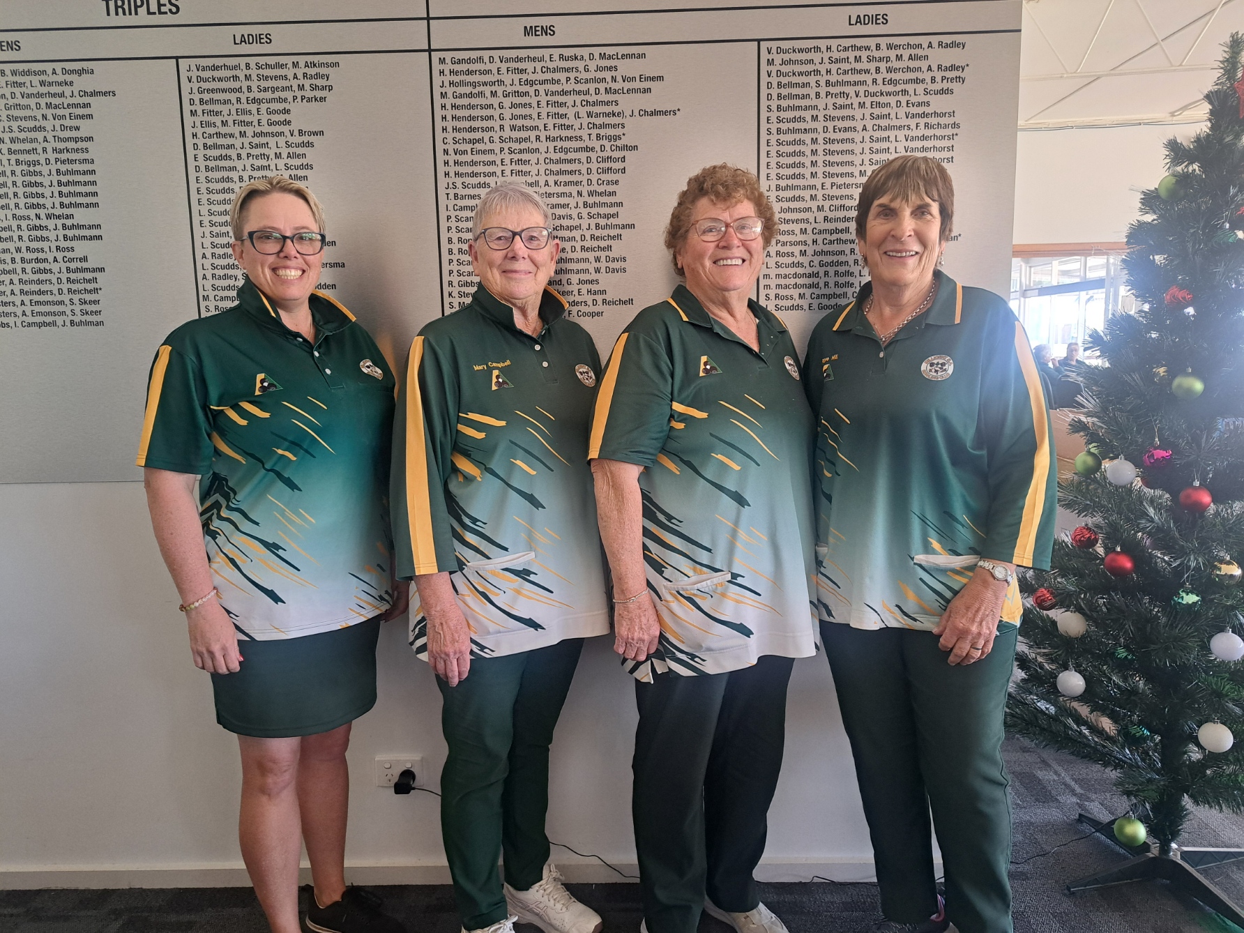 Lyn Scudds, Mary Campbell and Ros Varcoe and  Sarah Ross, Elaine Goode and Joy Warren.  The Scudds team, won 12 of the 18 ends and the  title of Triples Champions for 2025/26 Season.